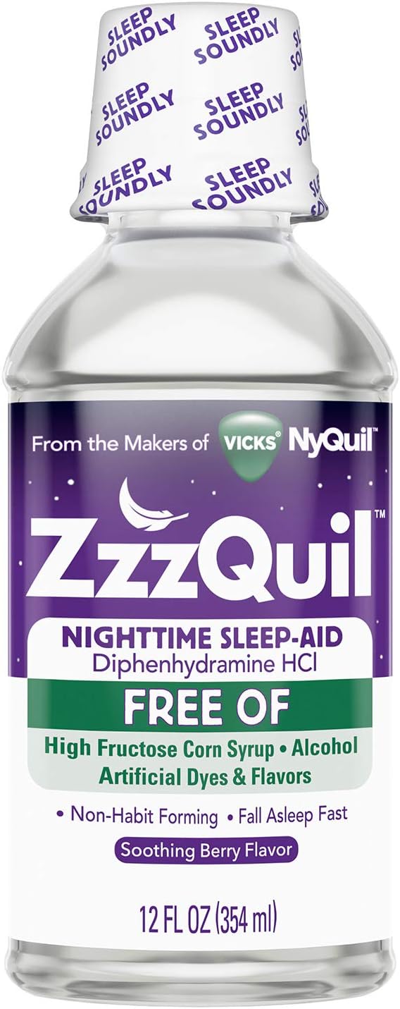 Amazon Com Zzzquil Nighttime Sleep Aid Liquid 50 Mg Diphenhydramine Hcl No 1 Sleep Aid Brand Free Of Artifical Dyes And Alcohol Soothing Berry Flavor Non Habit Forming 12 Fl Oz Health Personal Care