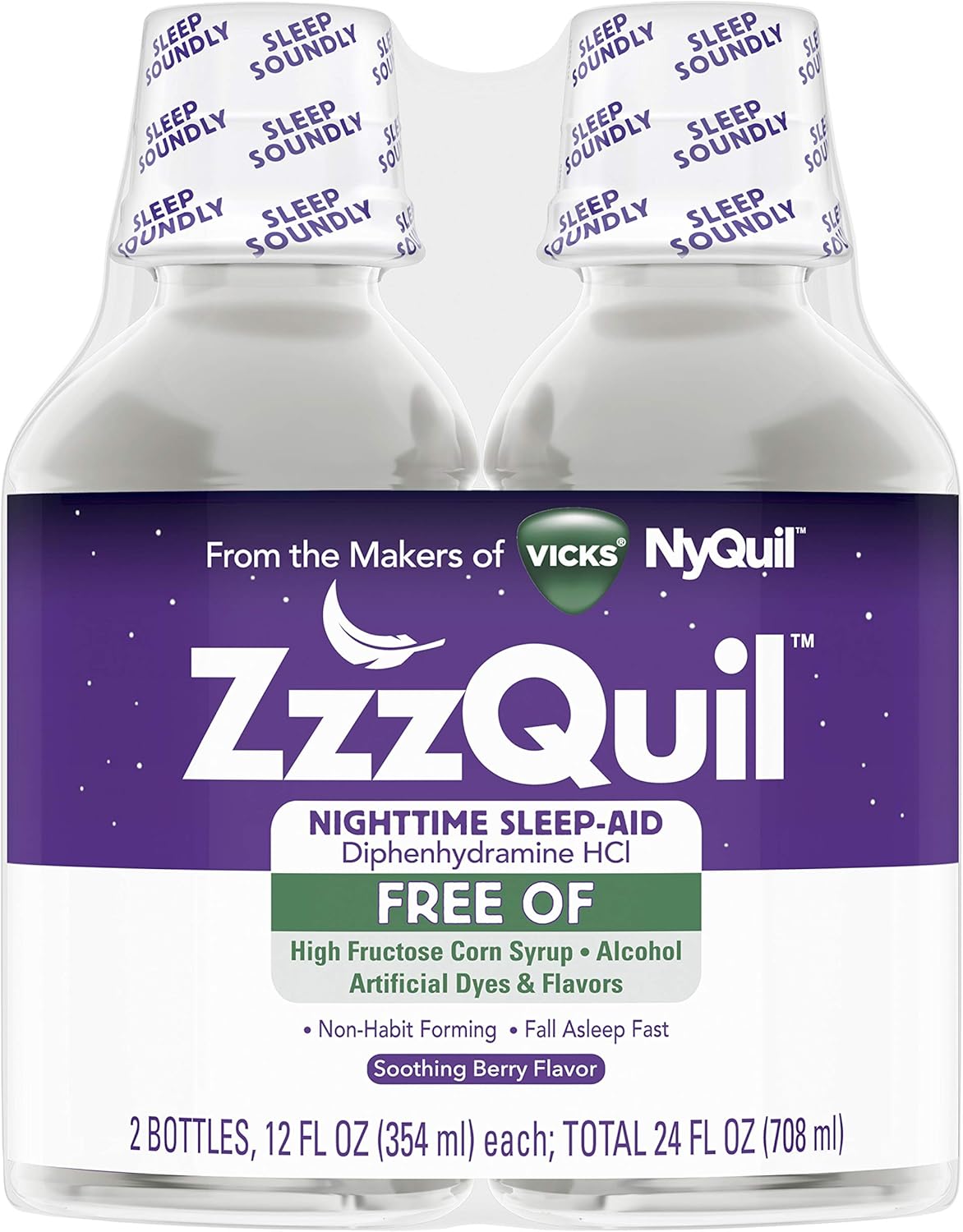 Amazon Com Zzzquil Nighttime Sleep Aid Liquid 50 Mg Diphenhydramine Hcl No 1 Sleep Aid Brand Free Of Artifical Dyes And Alcohol Soothing Berry Flavor Non Habit Forming 12 Fl Oz Twin Pack Health Personal